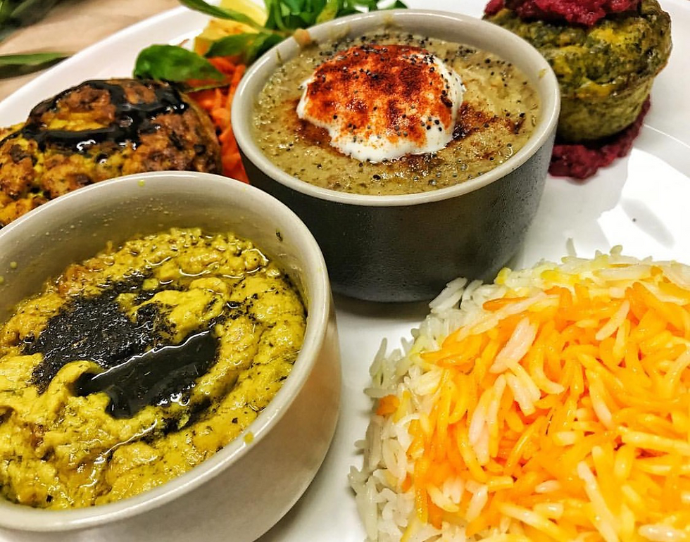 Mix di 4 deliziosi antipasti persiani servito con riso persiano allo zafferano